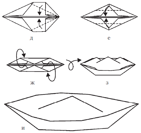 В заключение надо согнуть к вершине несвязанные уголки ромба так, чтобы между согнутыми уголками образовалась вершина из треугольников (рис. 4 з). Растянув эти треугольники в стороны, получаем аккуратную устойчивую лодочку (рис. 4 и).
