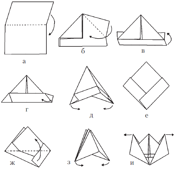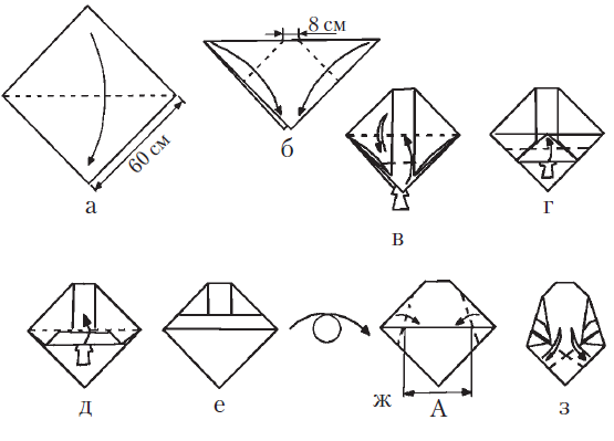 Из бумаги вырезать квадратный лист со сторонами по 60 см. Согнуть его по диагонали (рис. 10 а). Затем при помощи линейки отмерить центр основания получившегося треугольника и отложить от него по 4 см (рис. 10 б). Согнуть углы, прилежащие к основанию, таким образом, как показано на рис. 10 в. Далее уголки перевернутой вниз вершины загнуть и подвернуть по 2 раза (рис. 10 г – е.).