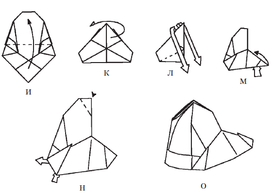 Перевернуть изделие и сложить его, как показано на рис. 10 ж, з. Потом провести горизонтальную линию по середине изделия и согнуть его пополам (рис. 10 и). Получившийся в результате пятиугольник сложить пополам по вертикали (рис. 10 к). Отвернуть верхушку (рис. 10 л) и перевернуть пятиугольник (рис. 10 м). Верхний уголок бейсболки заправить внутрь (рис. 10 н) и расправить изделие. Бейсболка готова (рис. 10 о).
