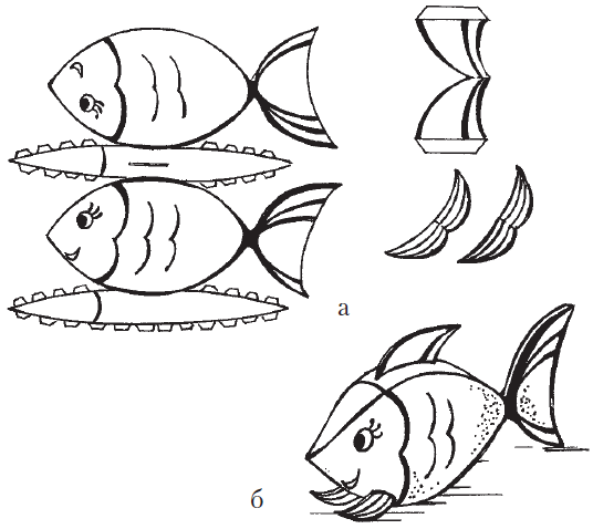 Каждый ребенок любит играть. Объемные игрушки, выполненные своими руками доставят малышу немало удовольствия. На листе плотной бумаги карандашом нарисовать детали рыбки (рис. 12 а) и вырезать их с помощью ножниц. Затем раскрасить фломастерами, согнуть по намеченным линиям. Приклеить нижние детали брюшка. В последнюю очередь склеить детали плавников между собой и наклеить их на рыбку (рис. 12 б).