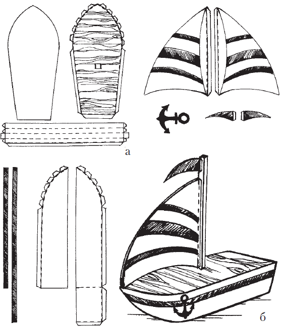 На листе плотной бумаги карандашом нарисовать все детали лодки (рис. 13 а) и вырезать их с помощью ножниц. Из цветной бумаги вырезать полоски и якорь и приклеить их к бортам лодки. Все детали согнуть по намеченным линиям. Затем склеить мачту. Борта приклеить к днищу, потом присоединить палубу. Приклеить в размеченное место мачту. В заключении прикрепить к лодке парус и флаг. Лодка готова (рис. 13 б).
