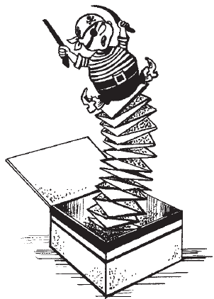 Коробочку обклеить снаружи и внутри цветной бумагой. Пружинку с игрушкой приклеить ко дну коробочки нижней стороной пружинки (рис. 16).