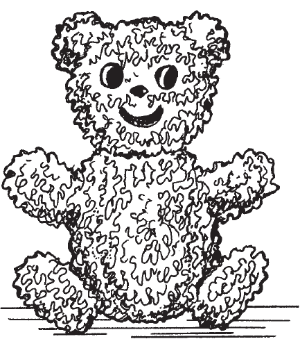 Слепить 2 пластилиновых шарика для туловища и головы медвежонка и 4 колбаски для его лап. Соединить все детали между собой. Затем нарезать из гофрированной бумаги много квадратиков размерами 1 X 1 см. Положить на серединку квадратика кончик зубочистки и скатать вокруг нее бумагу так, чтобы получилась трубочка. Не вынимая зубочистки из трубочки, воткнуть ее в пластилин. Такими трубочками заполнить все туловище и лапы медведя, начиная с нижнего ряда. Затем скатать небольшие кусочки бумаги в шарики и приклеить их к голове. Для рта скрутить в жгутик полоску бумаги шириной 1 см и приклеить к голове медвежонка (рис. 18).
