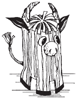 Челку выполнить из салфеток. Вырезать из них несколько кругов, диаметры которых должны быть на 2–3 см больше, чем диаметр трубочки. Сложить их вместе и склеить только в серединке. Приклеить все детали к трубочке. Рога приклеить с внутренней стороны трубочки. И только после них приклеить челку из салфеток. В последнюю очередь выполнить хвост, скрутив гофрированную бумагу в жгут и распушив его с одной стороны, и приклеить его к быку (рис. 19).