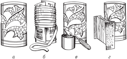 После чего изделие с наклеенным на него мозаичным набором надо потуже обмотать каким-либо жгутом, плотно укладывая виток к витку (рис. 11 б). Можно использовать ремень или веревку. Предварительно требуется обернуть изделие газетной бумагой. Тогда выступающий из-под скорлупы клей не прилипнет к жгуту. Когда клей окончательно высохнет, жгут можно удалить. Потом те участки, на которые не наклеена скорлупа, следует заполнить эпоксидной мастикой (рис. 11 в).