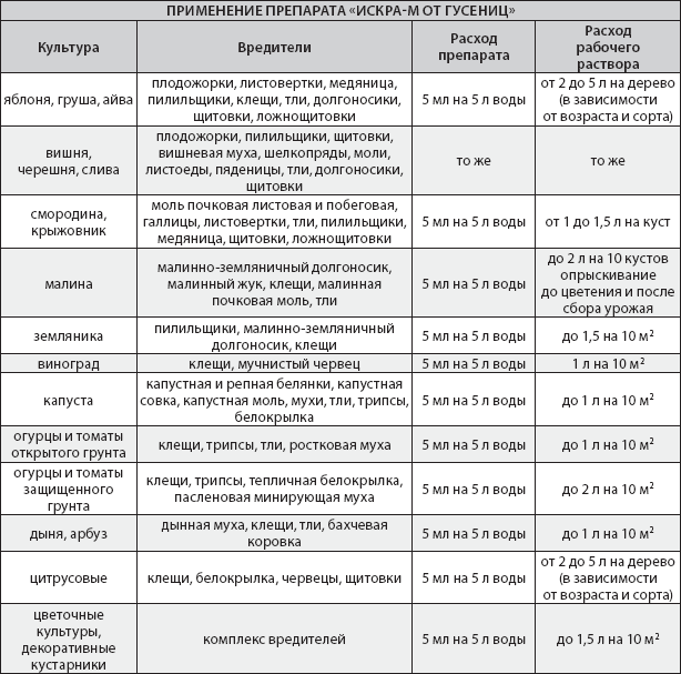 Огромный вред садово-огородным культурам наносят полчища гусениц – плодожорки, листовертки, пилильщики, огневки, совки и другие. Для борьбы с ними создан специальный препарат «Искра-М от гусениц» (флакон 10 мл, ампула 5 мл). Этот препарат особенно эффективен против вредителей овощных и плодовых культур. Обладает быстрым действием. Успешно применяется в теплицах.