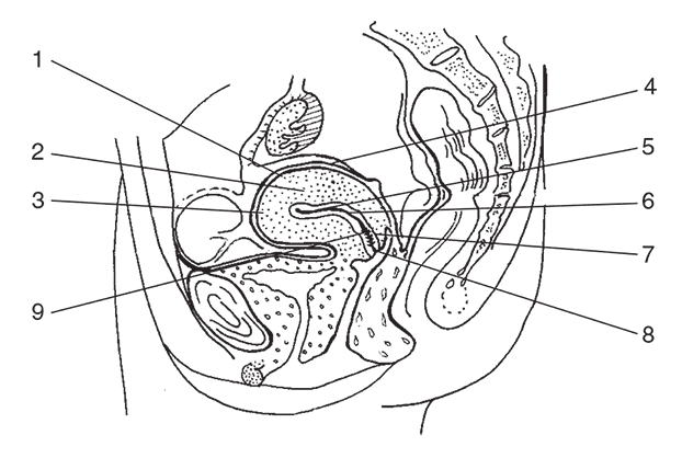Рис. 2. Органы малого таза: 1 – матка; 2 – тело матки; 3 – дно матки; 4 – кишечная поверхность матки; 5 – полость матки; 6 – перешеек матки; 7 – шейка матки; 8 – отверстие матки; 9 – канал шейки матки