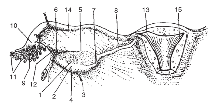 Рис. 3. Матка и придатки: 1 – яичник; 2 – внутренняя поверхность; 3 – наружная поверхность; 4 – свободный край; 5 – брыжеечный край; 6 – трубный конец; 7 – маточный конец; 8 – собственная связка яичника; 9 – брюшное отверстие маточной трубы; 10 – воронка маточной трубы; 11 – бахромки трубы; 12 – яичниковая бахромка; 13 – маточное отверстие трубы; 14 – маточная труба (фаллопиева); 15 – рог матки
