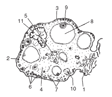 Рис. 4. Строение яичника: 1 – ворота яичника; 2 – свободный край; 3 – белочная оболочка; 4 – строма яичника; 5 – мозговое вещество яичника; 6 – первичные яичниковые фолликулы; 7 – корковое вещество яичника; 8 – главный (доминантный) фолликул; 9 – яйценосный бугорок; 10 – беловатое тело; 11 – желтое тело