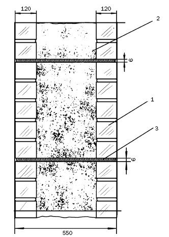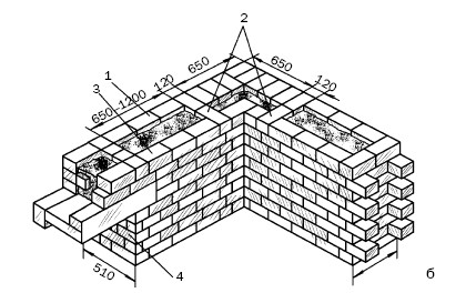 Рис. 71. Выполнение облегченной колодцевой кладки (размеры указаны в миллиметрах): а – фрагмент кладки; 1–4 – ряды кладки; 5 – поперечная стенка; 6 – раскладка кирпича на стене; 7 – заполненный колодец; 8 – растворная постель; б – кладка угла; 1 – продольные стенки; 2 – поперечные стенки; 3 – легкий бетон или засыпка; 4 – пробка