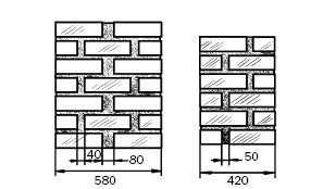 Облегченная колодцевая кладка (рис. 71) тоже представляет собой конструкцию из двух продольных стенок толщиной в 1/2 кирпича, расстояние между которыми составляет 140–340 мм. Для связи между ними с шагом 650–1200 мм по длине выполняются поперечные стенки толщиной в 1/2 кирпича.