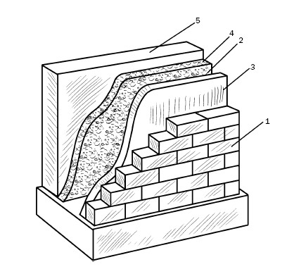 При второй разновидности несущая и облицовочная стены жестко связаны и воспринимают нагрузку от вышележащих конструкций. Обычно несущая стена выполняется из кирпича или блоков, изготовленных по различным технологиям.