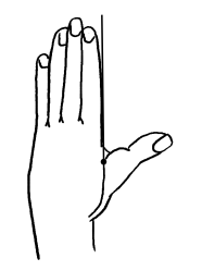 Для обучения приемам используют также точку GI4 – хэ-гу («Входя в долину»). Точка хэ-гу (рис. 14) находится на тыльной стороне кисти, в промежутке между первой и второй плюсневыми костями, в самой выступающей части первой тыльной межкостной мышцы при приведенном большом пальце кисти, а при скрещенных больших пальцах кистей – у конца большого пальца. Если в этой точке ощущается ломота, онемение и тепло, значит – воздействие оказано правильно. Точка хэ-гу как контрольная выбрана неслучайно. Массаж этой точки не приводит к негативным последствиям, поскольку ее назначение – повышать защитные силы организма и гармонизировать течение энергии.