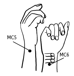 Одна такая точка MC5 расположена на четыре пальца выше нижней части сгиба кисти, а вторая – MC6 – на внутренней стороне предплечья, примерно на расстоянии трех пальцев от складки (рис. 28). Расположены обе точки на левой руке. Массаж делают, зажав кисть руки указательным и большим пальцами правой руки. Делайте мягкие и спокойные массирующие движения. Скажите себе, что сейчас сердечные боли или аритмия пройдут, вы снимете мышечные спазмы, и кровь будет снова равномерно и спокойно течь по вашим сосудам. Только полное расслабление наряду с массажем поможет снять приступ. Поэтому не массируйте эти точки в спешке, в неудобном положении. Вы должны быть предельно расслаблены, чтобы получить хороший эффект.