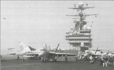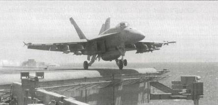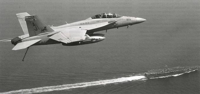 С палубы авианосца "Авраам Линкольн" стартует F/A-18E. Под крылом подвешены лазерная бомба GBU-16 (под левой консолью) и три 454-кг бомбы (под правой), на законоцовках крыла — ракеты "Сайдуиндер", под фюзеляжем — топливный бак