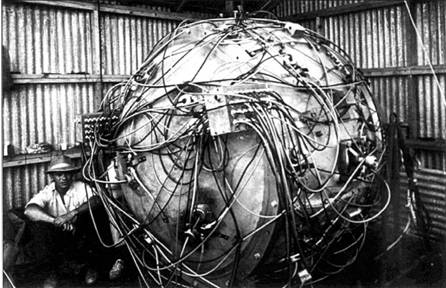 Бомба «Малыш» в яме, перед погрузкой в самолёт «Энола Гэй». Антенны высотомера установят позже