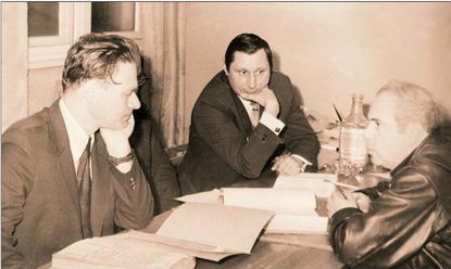 Заводское партийное собрание, слева направо: М.Л. Миль, С.А. Колупаев, Л.Н. Бабушкин