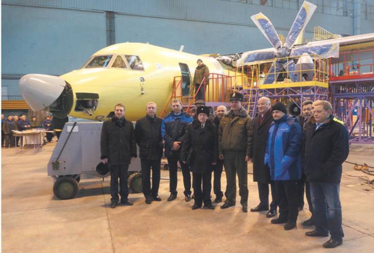 Фото на память: руководители завода и представители заказчика перед готовящимся к сдаче в начале 2013 г. новым Ан-140-100 (№007). Третий слева – генеральный директор «Авиакора» Алексей Гусев, третий справа – директор по авиационному бизнесу корпорации «Русские машины» Сергей Лихарев