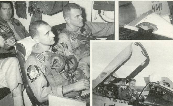 Лейтенант джуниор грэйд Филипп Вампателла (в центре) на инструктаже перед боевым вылетом. На фото справа запечатлён правый стабилизатор его <Крусейдера>, в который попал 37-мм снаряд, выпущенный пилотом МиГ-17. На фото справа внизу лейтенант Джин Чанси позирует в кабине своего истребителя.