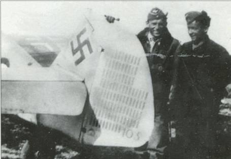 Один из ветеранов III/JG52 Альфред Гриславски позирует у хвостового стабилизатора своего Bf109G.