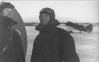 Командир 2-й эскадрильи 25-го ИАП капитан Н.ИЖуравлев (слева) и помощник командира 2-й эскадрильи 25-го ИАП старший лейтенант Я.ИАнтонов (справа) пози-руют на аэродромной стоянке. Сзади ви-ден И-16 тип 5 на лыжах с неснятыми ко-лёсами на основных стойках шасси.