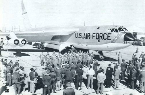 Торжественная встреча экипажа генерала Олдса, который на строевом В-52 в январе 1957 г. за 45 часов 17 минут с двумя дозаправками покрыл расстояние в 39.000 км.