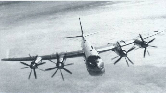 Первые туполевские «стратеги» Ту-95 начали поступать в 106- ю ТБАД в конце 1955 г. Серийные машины имели максимальную взлетную массу 172 т (Ту-95М — 182 т) и максимальную дальность полета без дозаправки 12.100 — 13.200 км. В принципе, такая дальность даже без дозаправки позволяла доставить «полезный груз» массой в десяток тонн в расположение заокеанского «клиента». Самолет-носитель Ту-95 вооружался бомбами трех типов: атомными РДС-3, РДС-4 и термоядерной РДС-6с. С 1957 г. ядерные испытания авиабомб мегатонного класса было решено перенести на Новоземельский полигон в интересах обеспечения безопасности (опытное поле Семипалатинского полигона находилось на расстоянии 170 км от города, а боевые поля на Новой Земле — не ближе 450 км от ближайшего населенного пункта — города Амдермы). В 1958 г. самолет-носитель Ту-95 прошел «боевое крещение», трижды использованный для экспериментальных сбрасываний изделий РДС-6с. Машину пилотировал полковник С.В.Серегин.