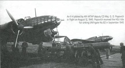 Ил-4 пом. командира 4-го мтап м-ра Г. Д. Поповича в полете, 12 августа 1945 г. За потопление фрегата №82 м-ру Поповичу в сентябре 1945 г. было присвоено звание ГСС.