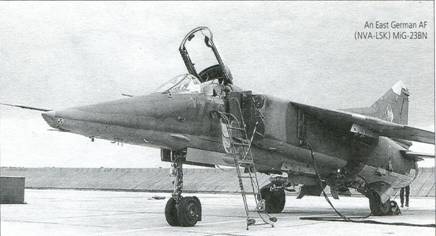 Германия(ГДР/ФРГ). В конце 70-х гг. на вооружении JBG 37 «Element Gottwald» (Jagdbomberfliegergeschwader — истребительно-бомбардировочная эскадра) ВВС ГДР все еще состояли МиГ-17 вполне пенсионного возраста. С 1979 г. немцы стали получать новые истребители- бомбардировщики МиГ-23БН, рассматривая их всего лишь как промежуточный шаг в процессе перевооружения. Всего было поставлено 22 боевые машины: 4/12/4 — в 1979/80/81 гг. и последние 2 — в 1984 г., получившие бортовые номера (не подряд) в интервале 689–731. Эскадра (2 эскадрильи) базировалась в Древице на юго-востоке страны, почти у границы с Польшей, и кроме боевых, имела на вооружении и три МиГ-23УБ.