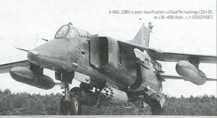 После воссоединения Германии все МиГ-23БН поступили на баланс Министерства обороны, и получили (3.10.1990) стандартные «инвентарные» четырехзначные номера (используемые всеми военными самолетами и вертолетами ФРГ). Однако собственно руководство люфтваффе вполне определенно решило не принимать большинство восточногерманских боевых самолетов на вооружение. В связи с этим все МиГ-23БН получили новые номера, но лишь на нескольких из них они были дополнены опознавательными знаками — эти машины поступили в исследовательское подразделение WTS 61 (Waffenteststaffel). Определенный политический курс (а также соображения целесообразности) заставили избавиться от советских машин. Часть была продана авиационным музеям — в основном германским (Гатов (Берлин), Шпайер, Ротенбург, Зайфертсхофен, Фихтельберг, Хермескайль, Обершляйссхайм, Кобленц), но один экземпляр попал в итальянский Cersola Museo dell Aviazione. Кроме того, пару машин в 1992 г. приобрела Великобритания, и еще две в сентябре 1993 г. — США.