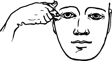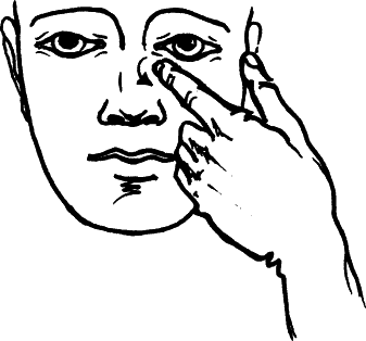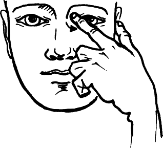 * Поместите указательный палец на верхний внешний угол глаза. Массируйте это место круговыми движениями 50 раз (рис. 46).