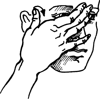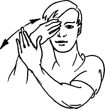 * Закройте один глаз ладонью или повязкой, но так, чтобы глаз под ней был открыт. Ладонь другой руки держите перед лицом на уровне переносицы на расстоянии 30 см от лица. Теперь мягко и легко обмахивайте (то приближайте, то удаляйте) открытой ладонью этой руки неприкрытый повязкой глаз, стараясь это делать так, чтобы ладонь обмахивающей руки находилась напротив прикрытого повязкой глаза. Приближайте и отдаляйте свою ладонь, одновременно давая возможность своему зрению отдохнуть на ней. Выполняйте упражнение мягко, ритмично 20–30 раз. Переставьте повязку и повторите то же самое с другим глазом. Когда глаз расслабляется и привыкает к смотрению и в ближней и в дальней точках без какого-либо усилия (поскольку он не видит ничего интересного для рассматривания или интерпретации), 4 натянутые прямые мышцы глаза согласятся расслабиться, и глаз сможет удлиняться по мере приближения ладони. Теперь вы готовы к работе(рис. 49).