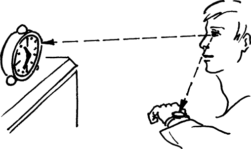 * Поставьте будильник на таком расстоянии от себя, чтобы вы могли его видеть. Если у вас еще хорошее зрение для дали, то будильник можно поставить у противоположной стены комнаты. Прикрыв повязкой или пластырем один глаз, посмотрите на цифру 1 на циферблате будильника, а затем на цифру 1 на ваших наручных часах. Смотрите мягко, расслаблено, без усилия. На секунду прикройте глаза и, вдохнув, на выдохе снова посмотрите на свои ручные часы. На первых порах большую помощь вам окажет хорошее сильное освещение циферблата наручных часов. Закройте глаза и мягко поворачивайте голову из стороны в сторону. Теперь посмотрите на цифру 2 на будильнике, а затем на наручных часах. Число на наручных часах должно стать немного четче. Если этого не произойдет, не расстраивайтесь. Закройте глаза, сделайте повороты головой и отдохните, прежде чем вы сделаете следующий вдох и посмотрите на цифру 3 на будильнике и на наручных часах (рис. 50).