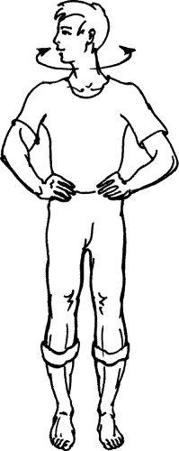 * Ноги на ширине плеч, руки на поясе. Резкие повороты головы вправо и влево, взгляд по ходу движения. Выполнить 50 поворотов (рис. 54).