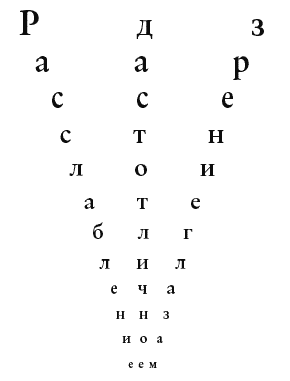 Повесьте лист на стену с хорошим освещением. Стоя близко к таблице прочитайте буквы сверху вниз: «Расслабление даст отличное зрение глазам».