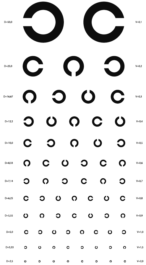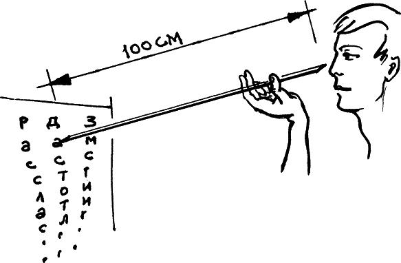 Как и в упражнении 1 расположите таблицу при хорошем освещении и выполните соляризацию, пальминг и упражнения для глазных мышц. Держа один конец линейки длиной 1 м за кромку близко к своему носу, другой конец направьте на верхнюю строку таблицы. Глядя на ближайший конец линейки, быстро моргните. Это положение «Приготовиться».