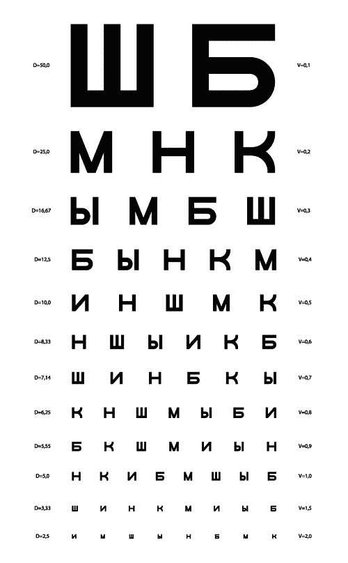 Не забывайте при переходе от одной строки к другой закрывать глаза и поворачивать голову из стороны в сторону. Сохраняйте эти короткие повороты головой, когда смотрите на таблицу.