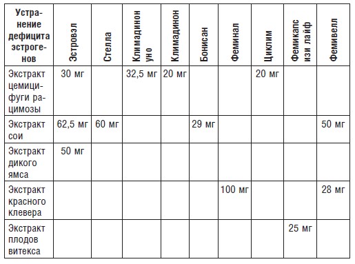 Бонисан («Фарма», Россия). Состав: изофлавоны сои. БАД способствует профилактике климактерических нарушений, нормализации обмена кальция. Эти препараты предусматривают и устранение дефицита эстрогенов, и уменьшение выраженности приливов, и коррекцию психоэмоционального состояния, и снижение риска образования эстрогензависимых опухолей, и профилактику обменных нарушений, и устранение дефицита витаминов и микроэлементов. Если сравнить эти препараты только по одному показателю – компонентам, устраняющим дефицит эстрогенов, то таблица будет выглядеть так: