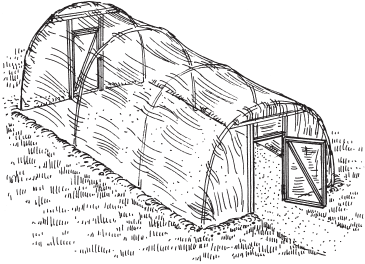 Укладывают оставленные снизу припуски в траншею и прикапывают землей. Во время закапывания полиэтилен притаптывают ногами, чтобы сохранить натяжение, которое придаст конструкции устойчивости. При наличии плинтуса края пленки прикрепляют к нему. Последний штрих – установка дверей (рис. 4).