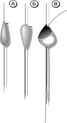 Другим важным условием для выбора поплавка по указанному принципу может быть ловля на течении с неровным дном, изобилующим валунами. Слишком чувствительный поплавок будет попросту скрываться под поверхностью воды при каждом касании грузом дна. Поэтому следует использовать более грузоподъемные поплавки с телом, расширяющимся вверх (рис. 4, Б). В случае же применения моделей с телом, расширяющимся вниз, то их целенаправленно недогружают, чтобы над водой видна была не только антенна, но и часть тела (рис. 4, В). Обычно на таких участках течение довольно сильное и атакующая рыба ведет себя менее осторожно. Зато рыболов попусту не отвлекается на ложные по клевки.