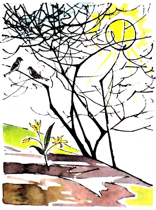 Но прошли осень и зима. И опять наступила весна. Старый куст ещё не успел проснуться, а внизу под ним какой-то сильный зелёный росток проколол прелые листья. Проколол, развернул свои листики, выпустил стебелёк и раскрыл жёлтую звёздочку-цветок.
