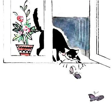 Киска испугалась. Киска повернулась, толкнула башмачки и — прыг на пол. А башмачки — бух! — во двор.