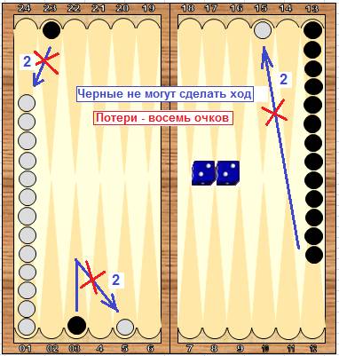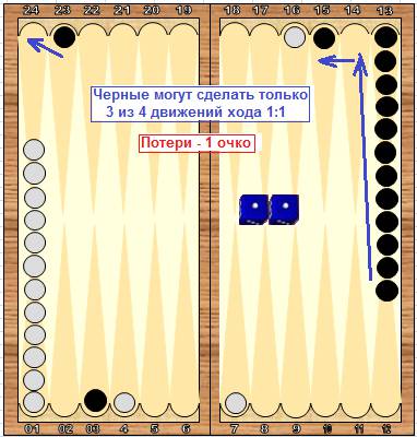 21 очко выпало на зарах, однако выбросить обе шашки не удалось. Игрок потерял 4 очка и в итоге вынужден сделать лишний ход.