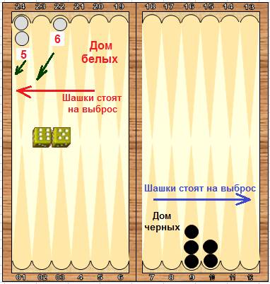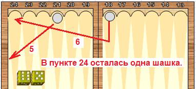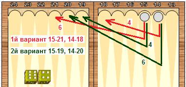 В позиции на рисунке шашки стоят на пунктах 14 и 15. Для того чтобы выбросить эти шашки, нужно 21 очко. Предположим первый бросок выпал 6:4. Можно пойти двумя разными способами. Вариант первый15-21, 14-18. Вариант второй15-19, 14-20. Теперь предположим, что второй бросок - 6:5. Итого 6+4+6+5=21 очко. Должно хватить для выброса шашек.