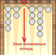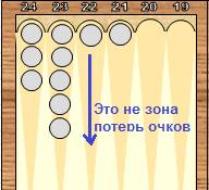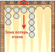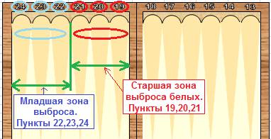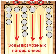 Потери очков происходят в младшей зоне выброса, если на зарах выпадают большие цифры, а на старших пунктах шашек нет. Значит, при заведении шашек в дом надо стараться заводить их в старшую зону выброса .