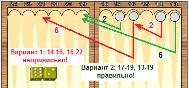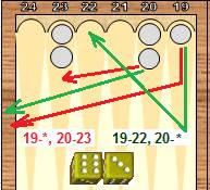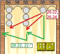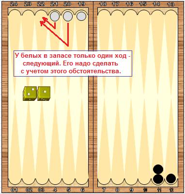 Ниже дана позиция, в которой выбор хода обусловлен не правильной схемой «улучшения», а тем, что у них на доске останутся 3 шашки, а следующий ход уже последний. Дело в том, что у черных три шашки, из них две они выбросят (если не выпадет куш) и останется только одна шашка на единичке. Итак, белые могут выиграть следующим ходом только если бросят куш, иначе 3 шашки не выбросить. На доске 15 пипсов. После хода 2:1 останется 12 пипсов. Это говорит о том, что белых могли бы спасти куши: 6:6 (24 очка), 5:5 (20 очков), 4:4 (16 очков) и 3:3 (12 очков). Если с 6:6, 5:5 и 4:4 помогли бы даже до хода 2:1, то про 3:3 надо подумать как раз этим ходом! Поэтому ходим 20-22, 21-22 (под куш 3:3), чтобы увеличить шансы на выигрыш.