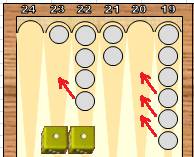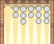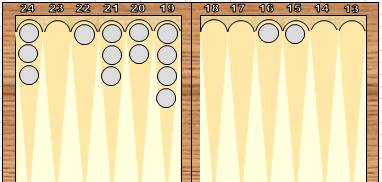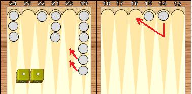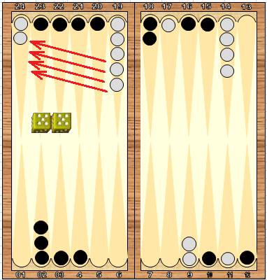В этой позиции черные сильно отстают по пипсам, но сумели занять выгодную позицию. Видно, что у черных большой запас ходов, и они не скоро откроют пункты 15, 16, 18, 21-23. Потери ходов белых здесь неизбежны. Поэтому тем обстоятельством, что улучшение в доме – это потери очков можно пренебречь! Удачно выпавший куш стоит использовать на перемещение шашек с пункты 19 на пункт 24. В пункт 24 попасть можно только при выпадении пятерки. А вот в пункт 19 можно попасть при выпадении 2 (с пункта 17), 5 (с пункта 14) и 6 (с пункта 13). И еще. Очевидно, что черные будут уходить в первую очередь с пунктов 15, 16, потом 18 и т.д. А значит, на пункт 19 попасть еще будет много шансов. Лучше пока переместить все свободные шашки на пункт 24.