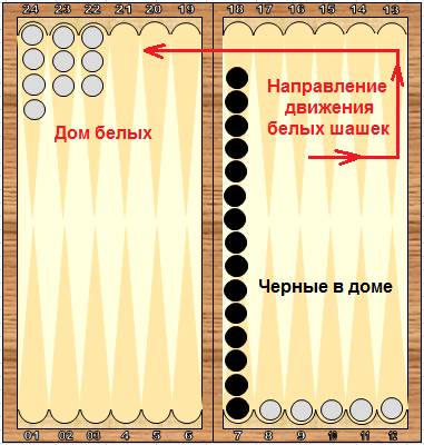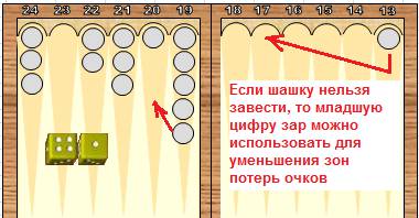 Для наглядности рекомендации рассмотрим один очень популярный среди опытных игроков прием, когда в доме соперника перекрываются все пункты, кроме одного, так, чтобы он накапливался там, откуда можно выбросить шашку, только если на зарах выпадет цифра шесть. Это еще иногда называют «посадить на шестерку». Позже особенности этого приема мы изучим подробно, т.к. он один из важных эффективных тактических приемов игры. А пока констатируем – избегайте попадания в такую «ловушку»