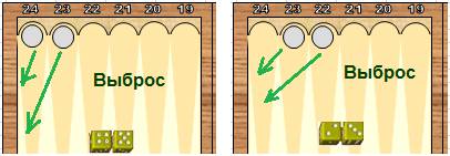 В позиции на картинке выше, зары показали 1:1. Это всего 4 очка. Причем выбросить можно только одну шашку. В этой позиции лучше пожертвовать выбросом и исправить перекос на старших пунктах: 19 и 20. Ходим 3 раза 19-20 и одну шашку с 22 на 23. Сравните получившуюся после такого хода позицию с начальной. Если выпадет хотя бы две пятерки, Ваша жертва окупится сторицей. А если 5:5 – то, возможно, этот ход окажется просто решающим!