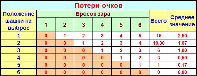 Видно, что наибольшие потери происходят, когда шашка попадает в пункт 24 (единица на выброс). Потери очков с пункта 19 (шестерка на выброс) равна нулю. Однако, именно это пункт наиболее опасен с точки зрения потери очков, если на доске нет пятерок. Потому, что тогда шашку приходится перемещать на позицию 1 (пункт 24), где она принесет в среднем 2,5 очка потерь. Соответственно потери от шашки в пункте 20 (пятерка на выброс) велики, только если нет четверок , и шашку приходится переносить на пункт 24 (единица на выброс).